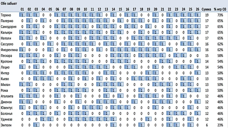 Единстенная команда, на которую точно не стоит ставить в этом показателе - это Эмполи (6 игр или 23%).
