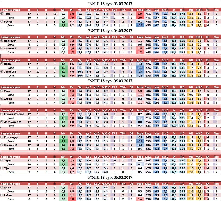 В меньшей степени это касается Рубина и Терека - 53% игр на ОЗ. Все остальные команды играют на ОЗ реже даже, чем каждый второй матч. Самый удивительный показатель у Уфы, а именно 3 игры из 17 на ОЗ. Феноменальный результат.
