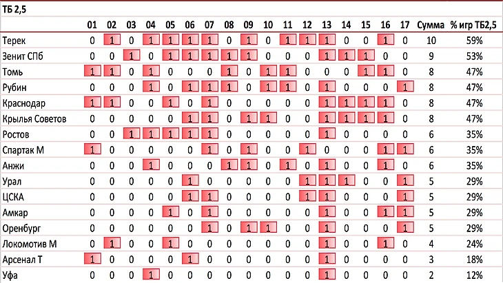 На тотал больше 2,5 лидирует Терек - приличный показатель в 59%. Чуть больше 50% у Зенита. Все остальные с показателями ниже 50%, а у 7 команд они ниже 30%. Лидер по ТМ 2,5 - Уфа - 2 игры или 12%. Делайте выводы.