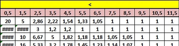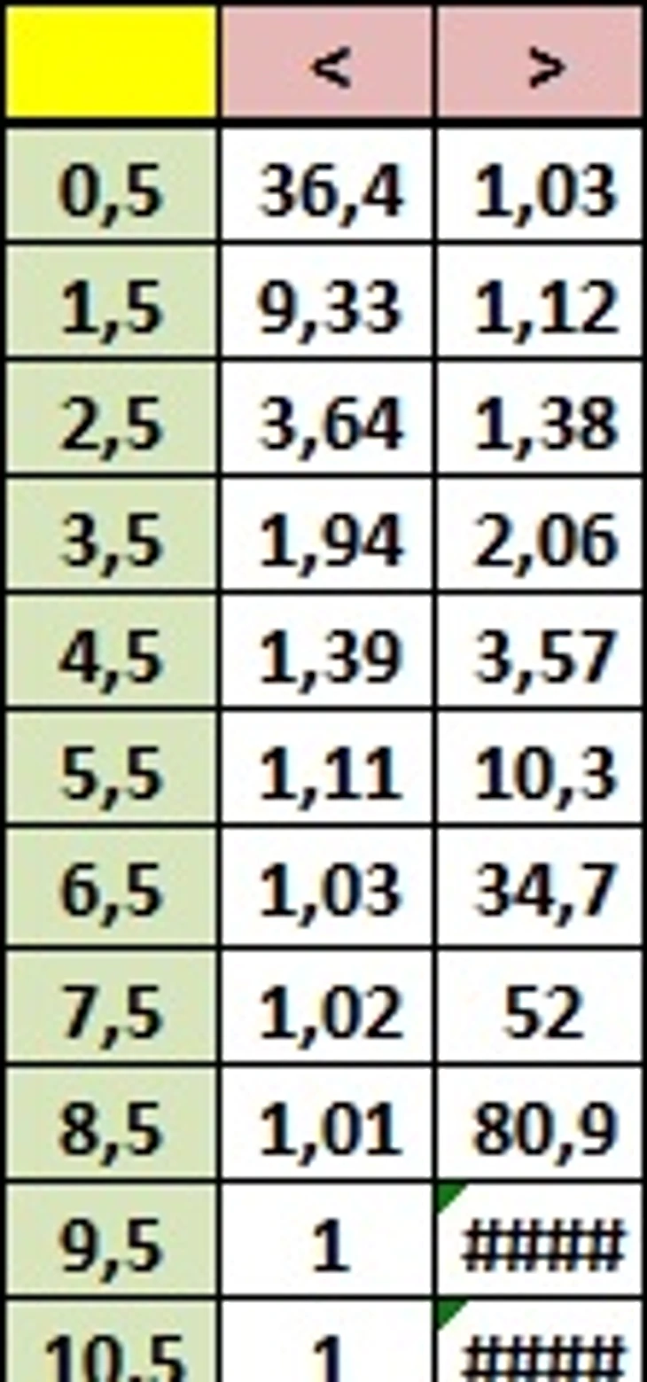 Если вы справились с расчётом вероятностей, перевести их в коэффициенты уже точно не составит труда! Осталось разрешить одну небольшую формальность: букмекерские конторы дают коэффициенты не на точное значение предупреждений, а на "больше" или "меньше" определённого числа, чаще всего дробного. Поэтому внесём завершающий штрих, и просуммируем вероятности для получения коэффициентов в том виде, в каком будет удобно сравнивать их с букмекерскими: