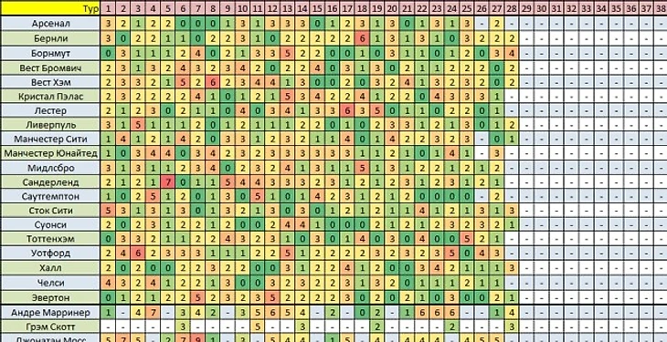 Замечу, что в эту таблицу руками не вносится ничего, кроме названий команд и имён рефери. Количество жёлтых карточек подтягивается автоматически из первой таблицы. Форматирование, обеспечивающее цветовое восприятие, также автоматизировано. Сразу хочу обозначить один момент: объяснять, что и как сделать в Excel, или же присылать готовую таблицу - по вполне, надеюсь, понятным причинам - я не планирую. Здесь мы говорим об идее и способе реализации, а не о технической стороне вопроса. Со сбором статистики покончено, переходим к математической части!