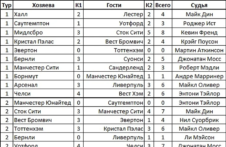 Вся информация о сыгранных матчах, количестве предупреждений каждой из команд, а также судьях, обслуживавших встречу, - вносится руками в таблицу вот такого вида:
