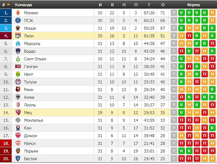 Мец (4-2-3-1): Didillon (28/0) — Signorino (14/0), Falette (27/3), Biševac (15/0), Iván (21/0) — Philipps (7/0), Mandjeck (22/2) — Lejeune (11/0), Cohade (25/0), N’Guette (24/1) — Erdinç (20/6)