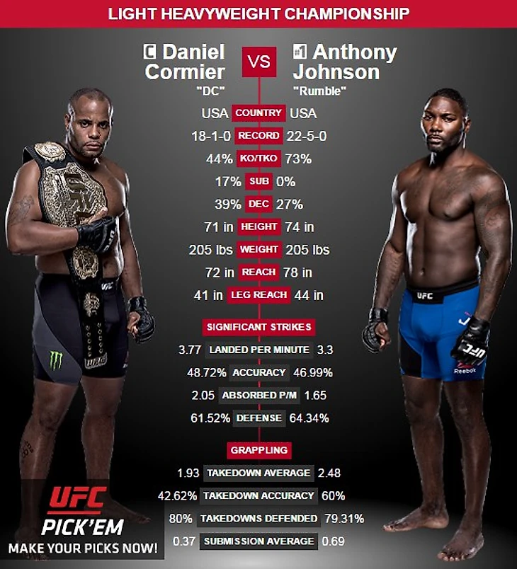 Классика смешанных единоборств - яркий ударник против выдающегося борца! Кормье - один из лучших борцов и тактиков, который в довесок способен "погасить свет" в глазах оппонентов. Джонсон - настоящий "рубила", атлетичный рослый спортсмен с пушками вместо рук и, что не мало важное с мозгами. Предыдущий бой проходил очень интересно: В начале первого раунда, Рамбл мощным прямым отправил в нокдаун Даниеля, но неудачный вход на добивание и он попал в стезю чемпиона - как итог проиграл.