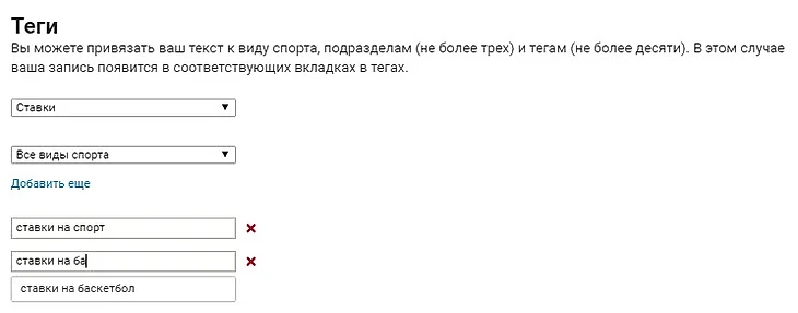 Таким образом, к своему посту теперь следует добавлять два тега: ставки на спорт + ставочный тег по виду спорта. Тег «ставки на спорт» пропускать ни в коем случае нельзя, иначе он не попадет в ставочный раздел.