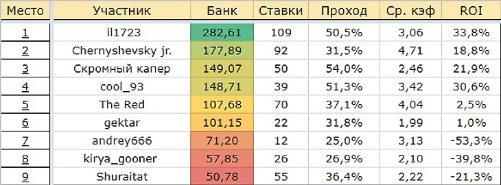 Сумасшедшая ставка зашла у il1723 с кэфом 11.50 на победу «Монако» с тоталом больше 3.5 голов! А еще на Лиге чемпионов у него зашли прогнозы за 4.70 и 5.40, что позволило ему вырваться в лидеры турнира. Серьезно увеличил банк Chernyshevsky jr. (впрочем, на менее известных клубах). Он может похвастаться кэфами 4.33 и 5.60.