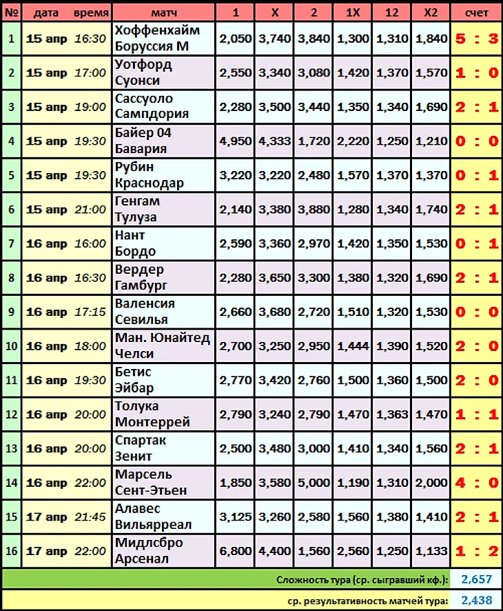 22 тур. 29-30 апреля. Матчи европейских чемпионатов. Пост с приемом прогнозов - 28.04.2017г.