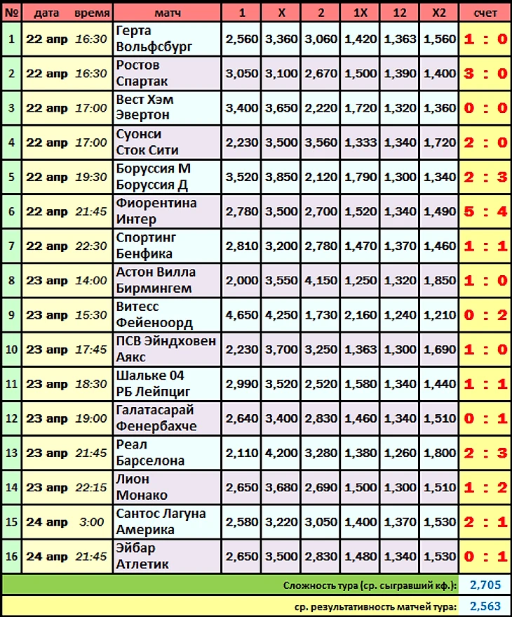 22 тур. 29-30 апреля. Матчи европейских чемпионатов. Пост с приемом прогнозов - 28.04.2017г.