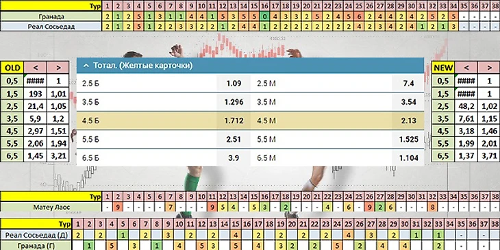 "Низ" в этой встрече просмтаривается лишь в том случае, если Гранада прямо в начале матча пропустит пару быстрых голов, упадёт лапками кверху и будет безвольно сливаться всю оставшуюся встречу по примеру Осасуны в прошлом туре. ТЖК>4,5 за 1,712 нужно брать в любом случае - когда ещё будет возможность сыграть "верх" в Испании) Коэффициент Матеу Лаоса 1,55. Я хочу заиграть ещё и ТЖК>5,5 за 2,51 - очень уж заманчива разница между коэффициентом букмекера и статистическим расчётом. 500 рублей на более рискованный вариант, 3000 рублей - на основной.