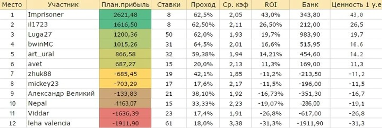 Завтра в 12:00 по Москве худший (12 номер) закончит борьбу на турнире, следующие этапы будут уже по 4 дня. На данный момент Imprisoner зажигает во втором турнире, ведь он так же участвует в Финале МЛБ турнира. А в Мировой Лиге он за счет качественных прогнозов лидирует вместе с Ильясом, они опережают ближайших преследователей очень серьезно. А всем кто в зоне риска, - вас ждет горячая ночка!)