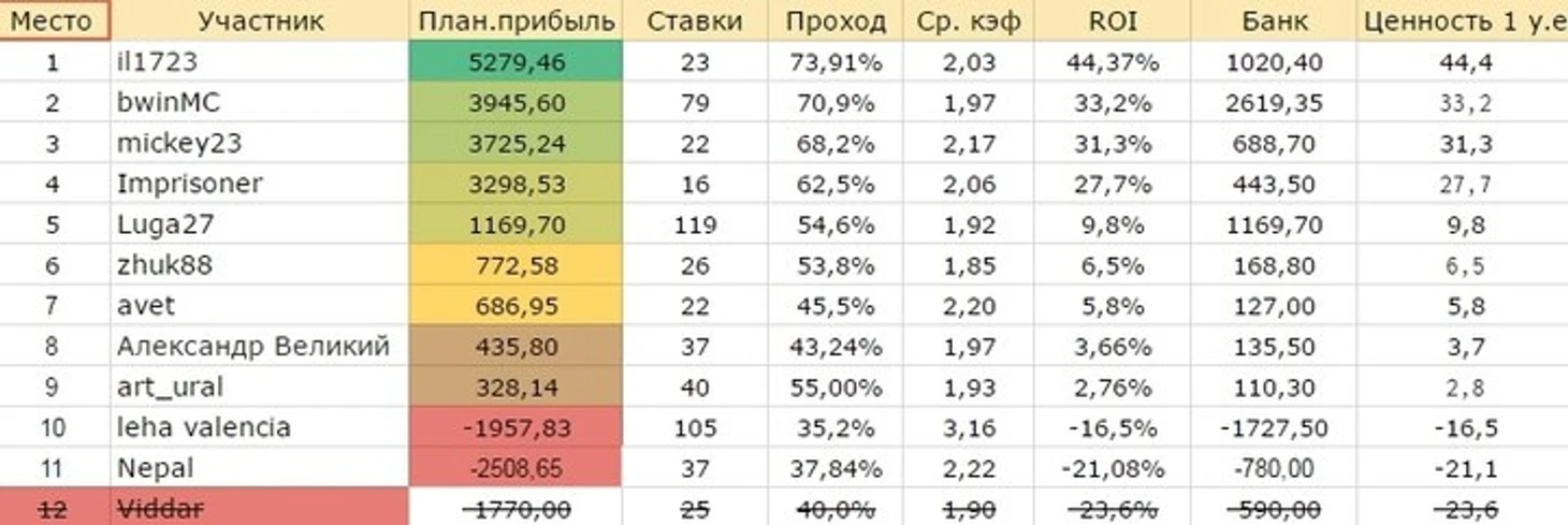 Похоже интриги на этот раз не будет и Леха с Непалом вылетят, на данный момент они единственные кто в минусе, а Леха еще и в серьезном минусе и отыграть его будет наверное уже невозможно, ведь нужно порядком 20 победных ставок!! без минусов!! У Непала задача проще, но он сам себя завалил выдав 1 из 12, и теперь нужно ему 11 из 12)). Наверху прочно обосновался Ильяс с неплохим отрывом, и он и bwinMC выдают 70% прохода, правда последний дал на 56 ставок больше! В целом уровень участников очень хорош и плюсуют все, но до вылета еще 2 дня, и все может кардинально измениться, тем более Ильяс еще не делал ставок на этом этапе, и если не сделает 4 минуса могут сильно отбросить его в таблице.