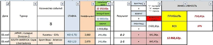 - проходимость ставок в Мае +4=0-4 (50%). Проходимость ставок вообще +35=5-38 (51,3%).