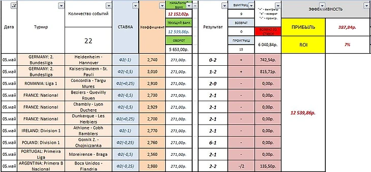 - проходимость ставок в Мае +9=0-13 (40,9%). Проходимость ставок вообще +47=5-52 (50%).