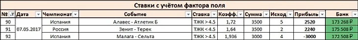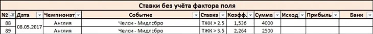 Несмотря на внешнюю очевидность того, что должно происходить в этом матче, доверимся статистике и поиграем "верха": ТЖК>2,5 за 1,536 и ТЖК>3,5 за 2,264. Разница между расчётными значениями коэффициентов команд и коэффициентом букмекера варьируется от 0,55 до 0,65 для 3,5 предупреждений. Это очень много. Согласно статистике Крэйга Поусона справедливый коэффициент на встречу для такого тотала - 1,83. А для 2,5 "горчичников" - так и вовсе 1,29. Для ТЖК>3,5 поставим 2500 рублей по стратегии, не учитывающей фактор поля, 2000 рублей - по новой схеме ставок. Для ТЖК>2,5 - 4000 и 3500 рублей соответственно.