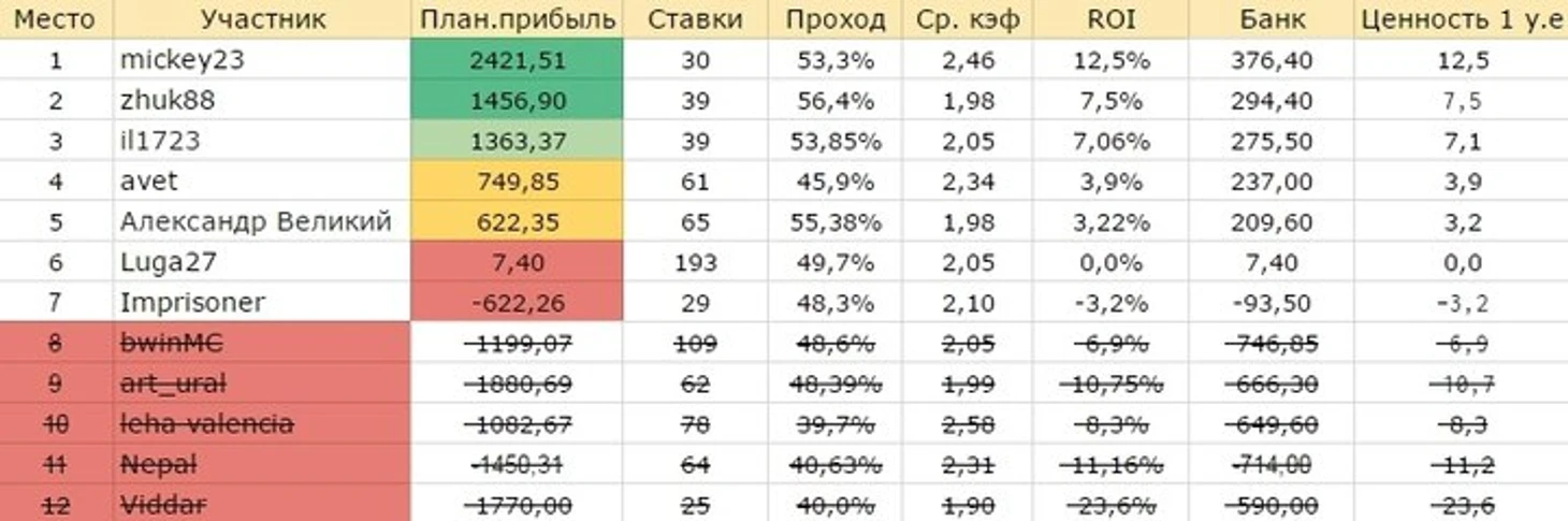 Начинается веселье, mickey23 дал две неточные ставки вчера и это его немного отбросило в таблице, и теперь 1 место не кажется таким уж безоговорочным. Тем временем zhuk88 и il1723 сохраняют свои позиции в таблице ничего не теряя почти. И кто бы мог ожидать что Авет и Александр Великий сделают такой мощный рывок и мало того что спаслись с вылета на прошлом этапе, так еще и на этом поднялись вверх по таблице отправив Лугу и Imprisoner в зону вылета, последний так вообще потерял вчера весь плюс скатившись на минус, Луга же вышел почти в ноль, но что бы ему подняться нужны сугубо плюсы, и это при условии что Авет и Александр не будут давать плюсы. Ситуация я бы сказал критическая, огромное количество ставок как и предупреждалось, вышли боком! Но, тем не менее будет интересно понаблюдать как он с этим справиться, ведь это чемпион прошлого турнира.