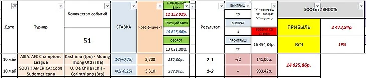- проходимость ставок в Мае +20=4-27 (47%). Проходимость ставок вообще +51=9-61 (49,6%).