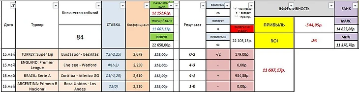 - проходимость ставок в Мае +26=6-52 (38,1%). Проходимость ставок вообще +57=11-86 (44,2%).