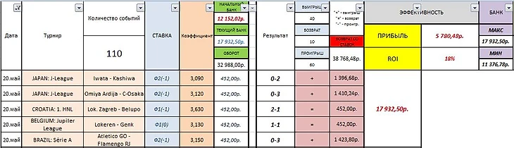 - проходимость ставок в Мае: +40=10-60 (45,5%, ROI: 18%)