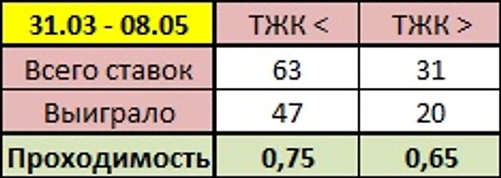 Нельзя не отметить, что почти в 2 раза упала проходимость и по "низовым" матчам. Что является, напротив, следствием повышенного градуса борьбы в ряде игр у команд, борющихся в концовке сезона за выживание/чемпионство. И это тоже не учитывает стратегия, что оказало очень весомое влияние на результат.