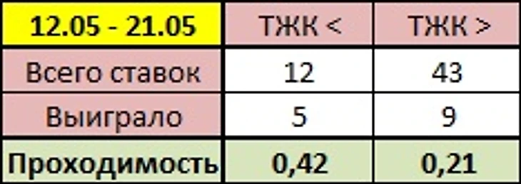 С показателями проходимости всё понятно, они упали просто катастрофически. Обратить внимание нужно в первую очередь на невероятное увеличение доли ставок типа "ТЖК >". Объясняется это очень легко. Мотивация команд в конце сезона сильно ухудшается, вероятность жёсткой борьбы и получения жёлтых карточек падает - это вполне резонно учитывают букмекеры. Но не учитывает наша стратегия, которая продолжает "выдавать" value там, где его уже и близко нет!