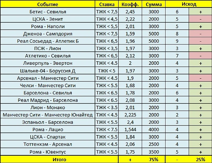 Эксперимент весенней части сезона со ставками на тоталы жёлтых карточек завершён. Я очень рад, что удалось выявить не только положительные стороны стратегии, но и её слабые места. Это позволит улучшить схему ставок и добиться значительных результатов в следующем, уже полноценном "боевом" сезоне.