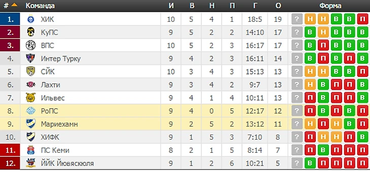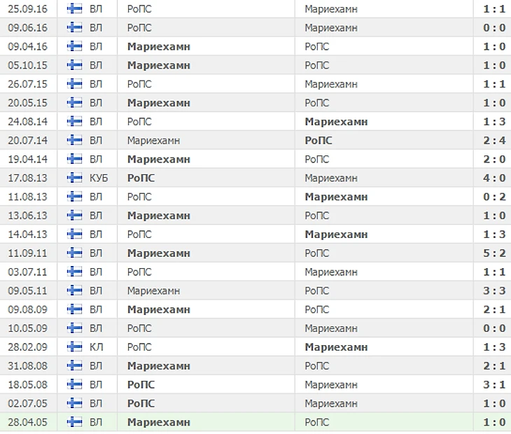 РоПСу повезло всех меньше. Они базируются на противоположном конце страны, поэтому по финским меркам у них получается сверхдальний выезд. Казалось бы, пустяки, но начиная с 2005 года РоПС всего раз побеждал Мариехамн в гостях. Да и вообще у них лишь 2 победы за последние 20 личных встреч, что крайне мало. Исторически неудобный соперник. Мариехамн побеждал куда чаще за это время (12 раз).