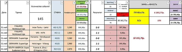 Последний день весны меня не особо порадовал: ни одной зашедшей ставки, два возврата. Более того, последние дни Мая сильно смазали картину, но все же нужно сказать, что в общем Май вышел весьма неплохим, так как и в начале месяца все складывалось не самым лучшим образом. Однако получилось неплохо заработать, особенно учитывая начальный банк и то, что я веду очень низкорисковый банк менеджмент.