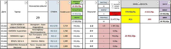 - проходимость ставок в Июне: +12=4-13 (55,2%, ROI: 20%)