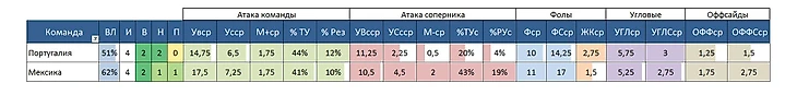 Исходя из этого, решил попробовать вот какую ставку. Как видно из таблицы выше, Португальцы получают в среднем 2,75 ЖК против 1,5 у Мексики. 2,75 это самый высокий показатель на турнире. При том, что Португалия не самая грубая сборная - всего 10 фолов за игру. Это говорит о том, что каждый их 5-ый фол становится жёлтой карточкой. Соперники Мексики в среднем нарушают правила 17 раз за матч (самый высокий показатель на турнире), поэтому чисто математически получается больше 1 ЖК португальцев. Тем более, если случится так, что Мексика будет вести в счёте.