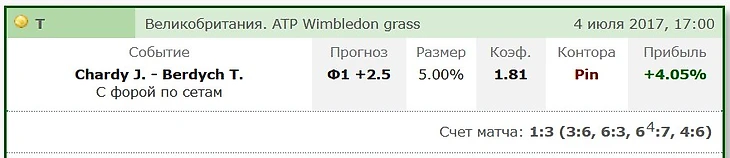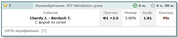 Как итог, считаю, что коэффициент на победу Бердыха несколько занижен. Так что тем, кто берет его победу в «пресс» стоит еще раз хорошенько подумать. Однако проверять чистую победу Шарди и вариации с форами по геймам я бы не стал. Все-таки играет он не ровно, да и класс чеха явно будет повыше. А вот заиграть фору француза по сетам (+2,5) за 1,81 по линии БК «Pinnacle» считаю можно и нужно. Тем более, что в единственной пока очной встрече этих соперников на траве два года назад на Уимблдоне Жереми уже брал сет у Томаша. Да и по результатам этого сезона, если вынести за скобки матч с Надалем, Бердых отдавал сет в 3-х играх из пяти.