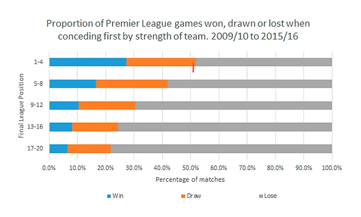 За семь последних полных сезонов Premier League в 69 % матчей выигрывала команда, забившая первый гол, ничьей закончились 19 % матчей и всего в 12 % игр отстававшей команде удавалось отыграться и победить. Разумеется, силы не всех команд равны. Если разделить турнирную таблицу лиги на пять групп, можно заметить, что процентные показатели побед, ничьих и проигрышей различается.