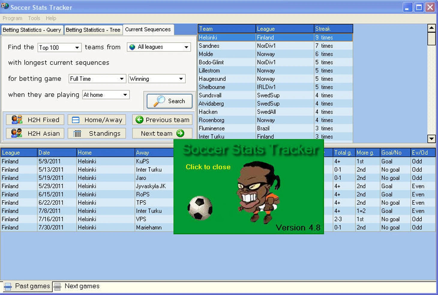 Полноценные программные самодельные продукты тех же направлений. Обычно обладают весьма простым и удобным интерфейсом. Также делятся на полезные калькуляторы, статистические ресурсы и бесполезные вычислители результатов, счетов и тоталов. Из полезных хотелось бы отметить SoccerStatsTracker55, которым пользуюсь сам. Данная программа показывает почти всю статистику большинства футбольных мировых лиг, а именно: серии команд, процент игр с определённым тоталом каждой команды, чёт/нечёт, результаты всех матчей, ОЗ и т.д. Ставку сама она не выберет и анонсов матчей там нет, но даёт огромное количество полезной информации, в особенности на тоталы и ОЗ. Подобные программы с небольшими отличиями также есть и на теннис с баскетоблом, называются OnCourt и BasketStat. Из бесполезных хочется отметить Total Over Analyser и все ей подобные (Opredelitel, Vanga Bet), который на основе пяти сыгранных матчей выбирает пальцем в небо тотал конкретного матча. Существуют также простенькие калькуляторы догона/Келли и т.п., но с этими функциями прекрасно справляется даже Excel.