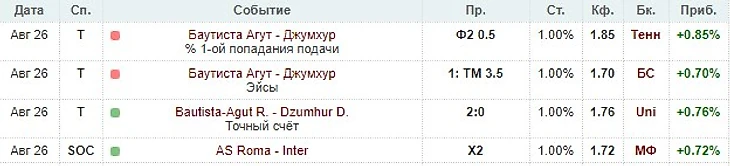 Ну и Ф2 +0.5 по проценту первой подачи за 1.85 зашла просто на легке. Результат 56-65