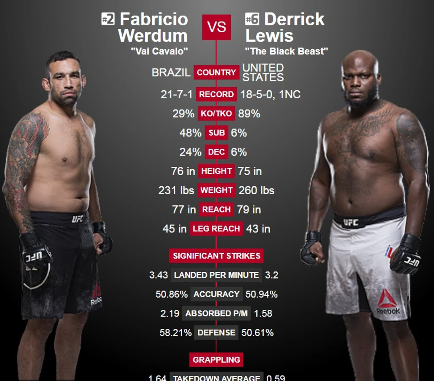 Дерик Льюис - самый забавный и зрелищный боец, как в октагоне так и вне. Чего только стоят его высказывания накануне и после боя с Трэвисом Брауном, а его репризы в Instagram! Очень физически силён и 89% нокаутёр. Однако, его выносливость оставляет желать большего. Тем не менее, судя по недавним фотографиям и видео, он стал легче, выносливее и быстрее.