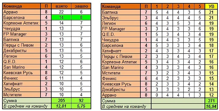 Лучшие команды тура по сумме УВ в целом: Балтика, Эльбрус (по 21 варианту)