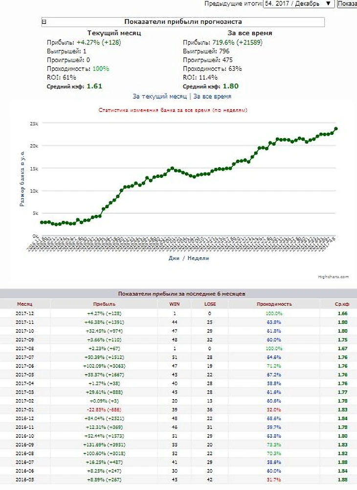 В прошлом месяце на этом сайте я очень мало дал прогнозов, т.к. особо интереса в плане ставок у людей не наблюдалось. Я считал иначе, думал что будет ажиотаж, поэтому сложно сказать, буду ли дальше здесь публиковать,время покажет.В платном разделе Впрогнозе как обычно вышел отличный месяц, собственно там вы можете ознакомиться со всеми прогнозами и приобрести подписку.Теннисный сезон для меня еще будет продолжаться 3 недели. Примерно с 20-22 декабря по февраль будет отдых.