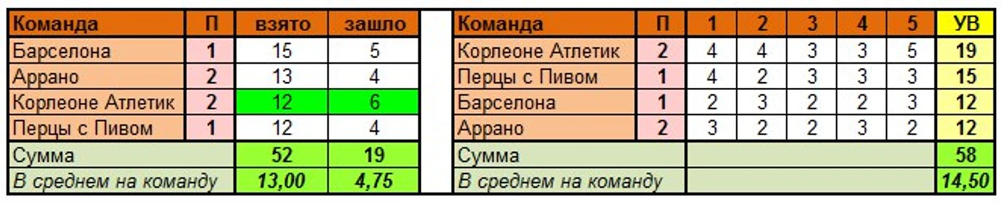 В командном плане участники, за исключением Корлеоне, сомневались в 6-ке, разместив её на 1-2 строчках. Всерьёз допускали они «4», но первый тайм прошёл без голов. Во втором счёт открыл Сауль из Атлетико, активировав «11», и это пошло на пользу Перцам в борьбе с Барселоной, на 3 линиях «11» был у них открыт, брали они всей пятёркой. Если Корлеоне полностью накрыли 6-14 (11 на одной не стали брать), то Перцы мощно ударили по 11-33. И очень правильно они сделали, так как Барселона тоже вложилась в "33" по максимуму. А вот заход «11» её подкосил. Барса больше нацеливалась на «верховые» сценарии, и один «14» тоже оказался свободным у её конкурентов. Челси по ходу МДП смог отыграться, случился автогол со стороны Савича, 1:1 сохранились до финального свистка. Барсовские 9-ки, можно сказать, компенсировали перцовые 6-ки, но разрыв в 11-14 остался. Никто из 20 игроков не взял в основную семёрку 22 и 25, 36 тоже светился лишь «на полке». Наиболее популярным из зашедших стал карточный «33», 16 включений из 20, по 2 игрока Корлеоне и Аррано выбрали другие варианты данного сегмента. Аррановцы могли отметиться с «39» (3 из 4 на их счету), но никто из тренеров команд МДП не прибегнул к ранней замене. Правда, при той линейке, которая сформировалась, заход «39» не спас бы их от поражения…