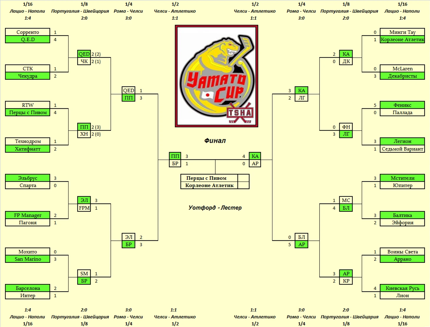 Первый обладатель Кубка в истории турнира возвращается в финал. Да, в весеннем сезоне 2012г. Корлеоне Атлетик ещё под именем Камелот пробился в главную стадию и на матчах группового этапа Евро-2012 победил Сталеваров по сумме 2 матчей. Тогда Кубок проводился в двухматчевом режиме раундов. Через полгода команда тоже прошла в финал, но проиграла, а ещё спустя полтора года взяла титул повторно, в первый сезон по формату одна игра на стадию. И уже под маркой Корлеоне Атлетик. А дальше, за 3 года максимум 1/4 финала. Перцы, напротив, в это время разыгрались, выход в 1/2 весной 2015г, и завоевание трофея ровно год назад, в борьбе с Мохито. Кроме того, Перцы регулярно далеко заходят в кубковых розыгрышах на укр. и бел. Трибунах. И на первый взгляд, победа коллектива Дяди Вити выглядит более вероятным исходом. Но в текущем розыгрыше Корлеоне очень хорош, в 3 матчах из 4 не пропустили ни одного гола. Отстоять «сухарь» и так непросто, а в 3 из 4 играх на вылет вообще подвиг. Перцы же и забивали, и пропускали, а в 1/8 дожали соперника только по доп. вариантам. По текущей форме обе команды смотрятся крепко, допустили по 1 поражению в последних 6 матчах. По раскладкам УВ в последних 4 турах (без учёта неявки Перцев) соперники обменялись бы 2 победами 2:1 и 3:1. В реальных личках тоже по сути равенстве, 3 на 3 плюс один «технарь». Занятно, что «технарь» оборвал победную серию «мафии» и положил начало «перцовой», одна из викторий состоялась, кстати, победном для Перцев кубковом походе. На английских МДП у финалистов в этом сезоне получается в целом неплохо, но не более того. Между собой ровно, виртуальный размен победами 2:1 и ничья 2:2. Так что, лично я ожидаю сейчас победы одной из команд с разницей 1-2 гола, и что обе забьют. Кто бы ни выиграл, искренне поздравлю с победой, обе команды показали себя достойными трофея :)