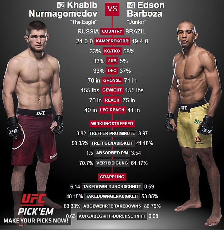 Хабиб Нурмагомедов - дагестанский орёл. Борец высочайшего уровня. Хабиб три раунда бросал из угла в угол бывшего чемпиона Рафаэля Дос Аньоса, как мешка. Кстати, на прошлом турнире Дос Аньос уничтожил Робби Лоулера, если кто-то вдруг думает, что это ноу нейм. Хабиб ведёт аккуратную и грамотную игру в октагоне. Ни один ударник, не смог нанести ему урона, значимого, но и он сам, к сожалению не обладает ударами, для значительного урона.