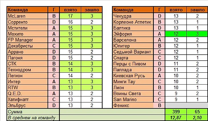 Лучшие команды тура по сумме УВ в целом: Интер, СТК, Технодром (по 9 вариантов)