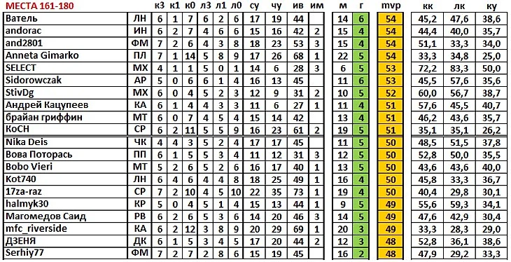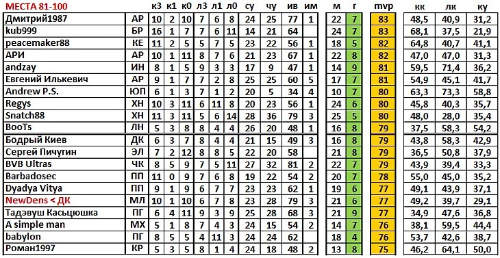 наконец, последние три колонки: кк – коэффициент командного участия (% очков от максимально возможного их количества, когда за команду выступал данный игрок); лк – личный коэффициент (% очков от максимально возможного их количества, набранных игроком); ку – коэффициент «угадывания» (% «своих угаданных» от общего числа игровых.