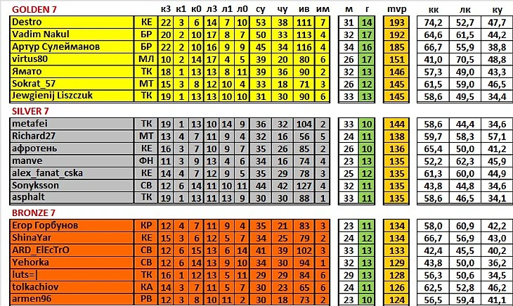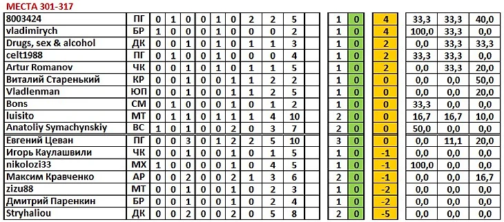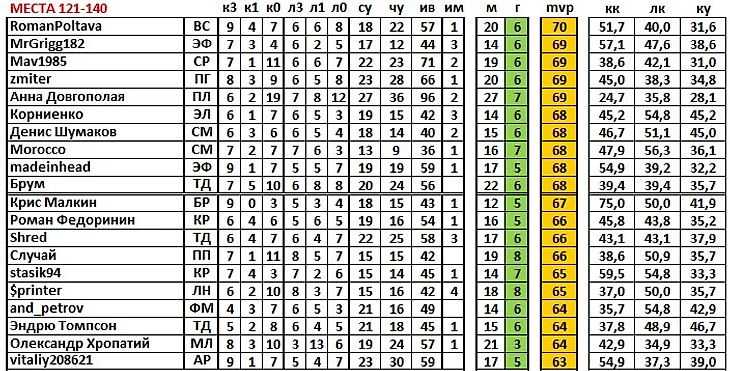 затем идут личные показатели игрока в микродуэлях (л3 – победа, л1 – ничья, л0 – поражение);