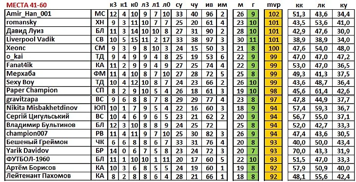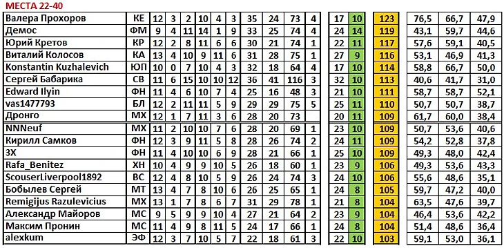 дальше должно быть понятно: м – матчи, г – голы (зеленая колонка);