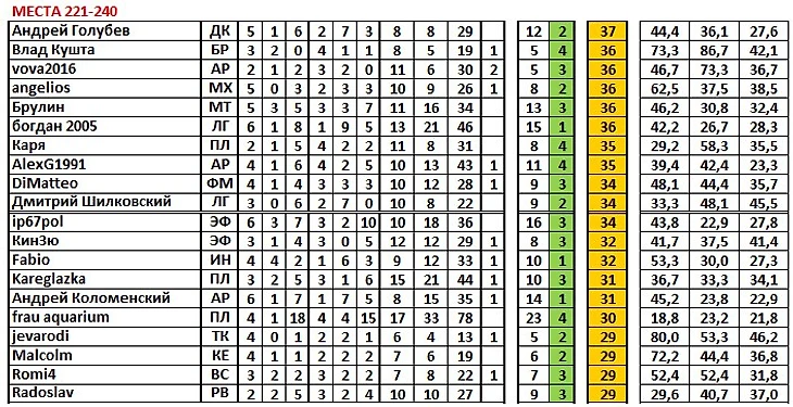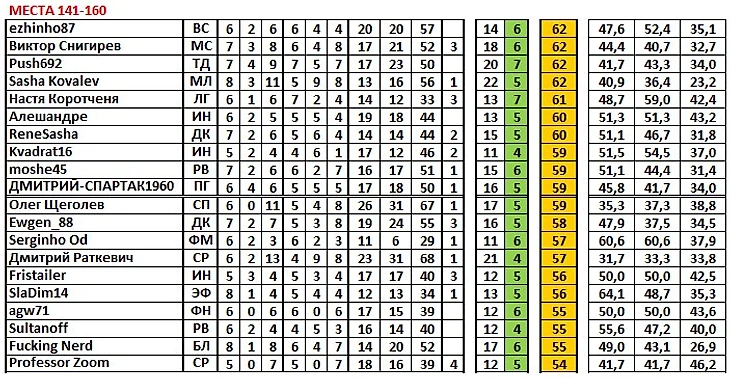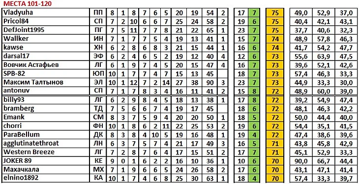Дальше. В матчах плей-офф (Кубка и Суперлиги), где применяется формула 7+2+1, игроку идёт в зачёт один итоговый командный результат и два личных – на основных вариантах и на дополнительных. alex_fanat_cska сыграл в таком матче (кубковом против Чекудры – 4:3), где выиграл (л3) на основных вариантах и сыграл вничью (л1) на дополнительных. Поэтому у него 25 командных матчей и 26 личных.
