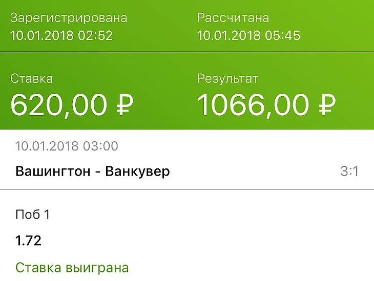 Вашингтон - Ванкувер П1 за 1,72 (Фонбет) Ставка: 620