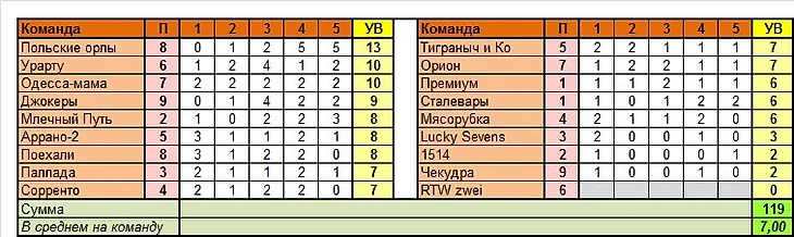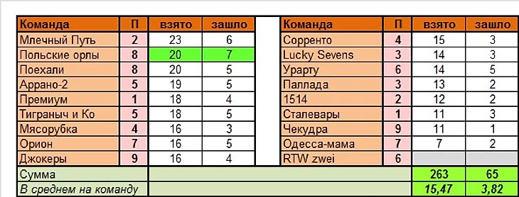 Лучшая команда тура по сумме УВ в целом: Польские орлы (13 вариантов)