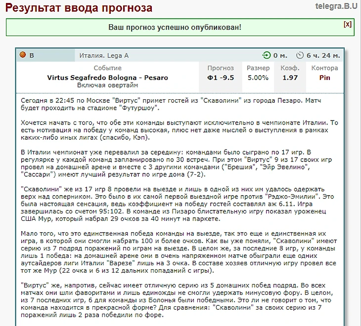 Сегодня у нас как раз по этой схеме подошел матч чемпионата Италии. Это, кстати, будет наша первая ставка на любой чемпионат, кроме Евролиги и НБА, а так же это первая ставка на минусовую фору за всю историю нашего телеграмм-канала (t.me/bitbasketball).