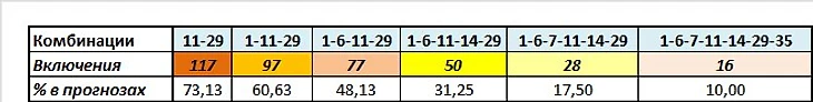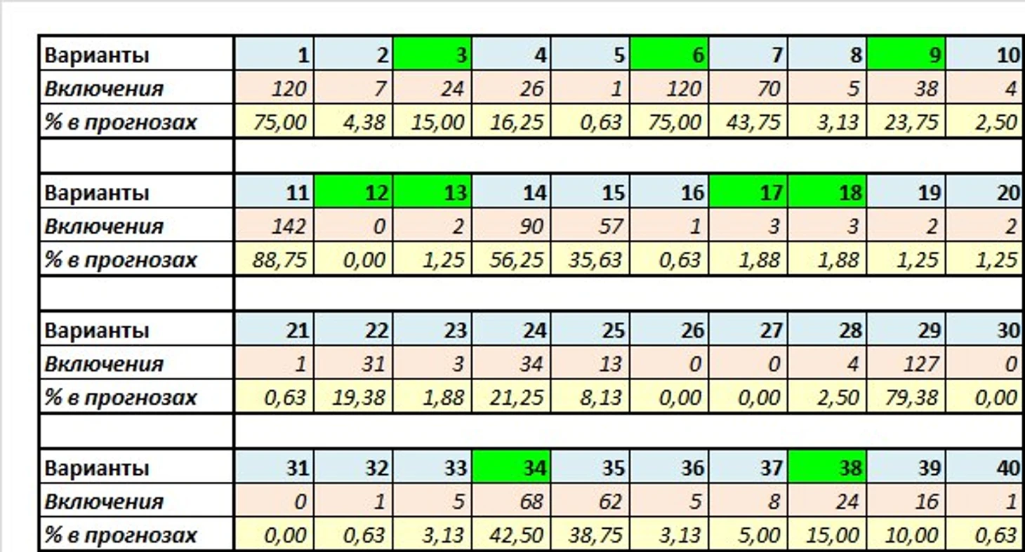 В данной и других таблицах поста указаны результаты прогнозов по основным семёркам, без учёта секций доп. вариантов