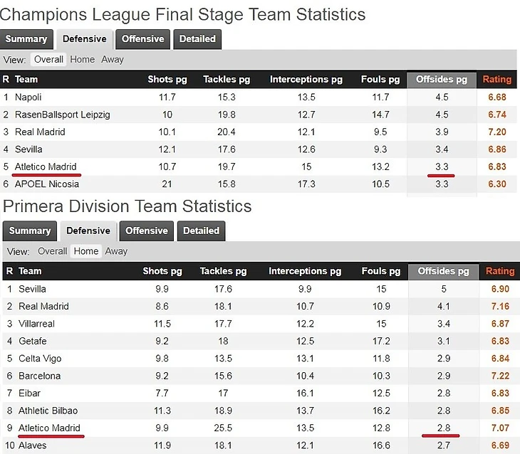 В Лиге Чемпионов по этому показателю Атлетико входил в топ-5 с показателем 3,3 офсайда за игру. В чемпионате показатель чуть ниже - 2,8. Зато мадридцы лидируют в Лиге Европы по среднему количеству офсайдов - 3,5 за игру. Но, справедливости ради, "матрасники" провели в этом турнире всего 2 матча.