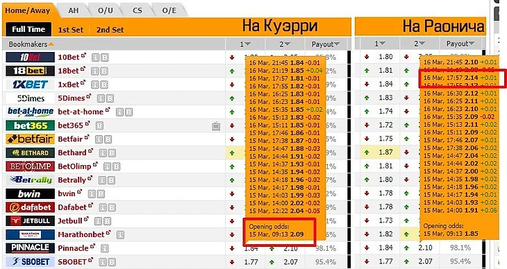 В большинстве случаев, первыми выкатывают линию, как братья-близнецы, Марафон и 1xBet. После них уже обычно идёт Pinnacle. Ориентируясь на котировки пинки уже и все остальные вылазят из ущелий со своими котировками. Будем ориентироваться на Марафон и Pinnacle.